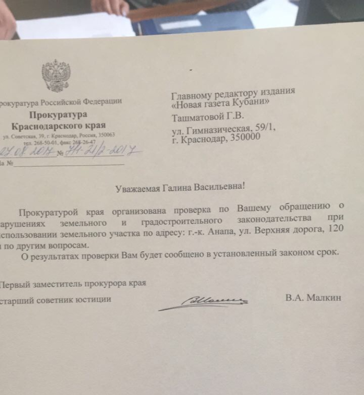 Как сообщил редакции первый заместитель прокурора Краснодарского края Владислав Малкин, прокуратурой Краснодарского края организована проверка по обращению редакции о нарушениях земельного и градостроительного законодательства при использовании земельного участка.