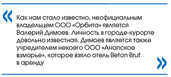 Хозяин мэрии, господин Сергеев, пребывал на этот момент в предвыборном отпуске. Но все равно нам удалось получить от исполнительной власти города ответ. Для администрации, как оказалось, не новость то, что ООО «Орбита» без получения разрешения на строительство, с нарушением градостроительных и строительных норм возвело капитальные объекты коммерческого назначения – восьмиэтажное здание отеля Beton Brut с пристройкой и навесом и ряд других строений, в том числе два бассейна в г. Анапа по ул. Верхняя дорога, 120 на земельном участке, предназначенном для размещения производственной базы и складских помещений. Администрация города в ходе очередной проверки выявила все эти вопиющие нарушения. Заметьте, нарушения происходят на арендуемом у мэрии земельном участке! Более того, в августе 2016 года администрация города-курорта Анапа подала исковое заявление в Арбитражный суд Краснодарского края о сносе самовольных строений. В заявлении власти города просили суд принять обеспечительные меры в виде запрета ООО «Орбита» и иным лицам осуществлять ЭКСПЛУАТАЦИЮ спорных объектов, а также запретить Управлению Росреестра осуществлять государственную регистрацию прав и сделок с ним. Арбитражный суд Краснодарского края своим определением от 08 августа 2016 года заявление администрации о принятии обеспечительных мер удовлетворил частично – запретил лишь осуществлять регистрацию прав, переход прав и сделок в отношении земельного участка и объектов недвижимости по данному адресу. Но эксплуатацию незаконно возведенного здания суд НЕ ЗАПРЕТИЛ!