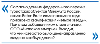 В качестве объекта исследования мы выбрали относительно новый четырехзвездочный отель Beton Brut, реклама которого в интернете отличается особой агрессивностью. Без особого труда удалось нам заполучить документы этого фасонистого комплекса гостиниц, погрязшего в судебных тяжбах. Под броским иностранным названием скрывается не просто банальный самострой, а дерзкое сознательное нарушение всех мыслимых и немыслимых градостроительных норм. А теперь по порядку.