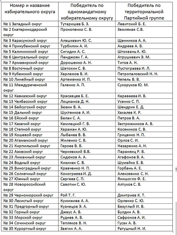 Чем ближе выборы в Законодательное Собрание края, тем больше вокруг них возникает информационной шумихи. Что вполне закономерно- это чуть ли не главные выборы на краевом уровне, поэтому появление разного рода слухов и вбросов более чем ожидаемо. Вот и буквально сегодня в редакцию НГК пришел интересный документ: «Список победителей предварительного голосования по кандидатурам для последующего выдвижения от партии «Единая Россия» кандидатов в депутаты Законодательного Собрания Краснодарского края». Как сообщает анонимный рассыльщик, данный список утвержден «за 30 дней до единого дня предварительного голосования губернатором, вице-губернатором и согласованный с секретарем Регионального отделения партии «Единая Россия»».