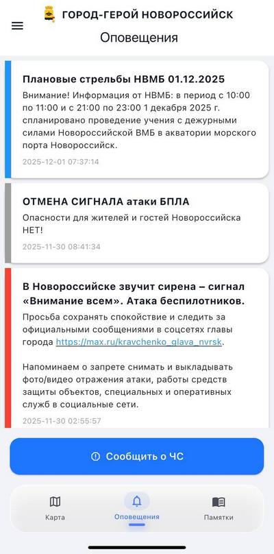 Данное приложение интегрировано с муниципальной системой оповещения. Вы будете получать PUSH-уведомления о поступающих угрозах, их отмене, плановых учениях НВМБ и другой жизненно важной информации. Также есть функция для оперативной отправки сообщений в службу «Безопасный город» о чрезвычайных ситуациях, обнаружении БПЛА или их обломков.