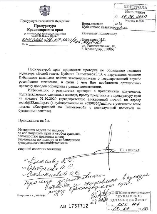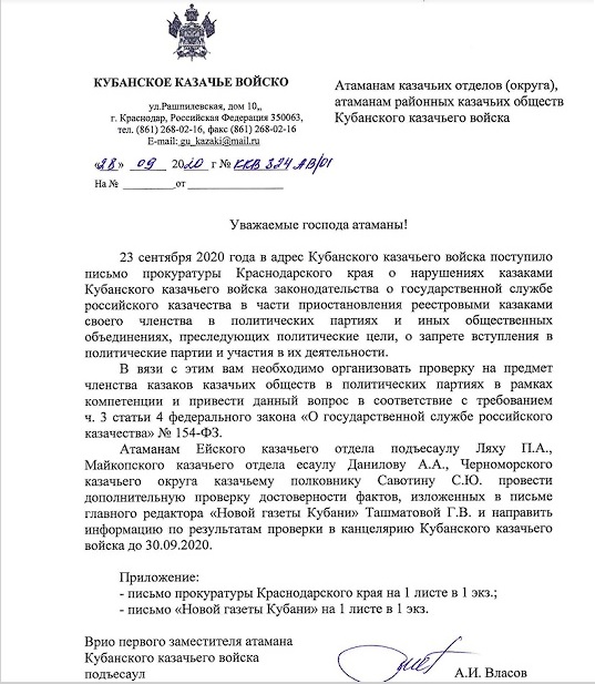 Напомню, что 28 сентября 2020 года атаманам казачьих отделов и районных казачьих обществ за подписью ВРИО первого заместителя атамана Кубанского казачьего общества Александра Власова поступило письмо. Он рекомендовал нижестоящим атаманам провести проверку и установить, кто из казаков совмещает членство в политических партиях с членством в казачестве и привести в соответствие с требованием части 3 статьи 4 федерального закона «О государственной службе российского казачества» № 154- ФЗ. О результатах проверки с подтверждением документов о сделанных выводах необходимо было проинформировать прокуратуру Краснодарского края до 1 октября 2020 года, сначала по электронной почте, а потом уже официальным письмом, согласно письму, поступившему в ККВ из прокуратуры Краснодарского края 23 сентября того же года (ред. копии этих документов смотрите ниже).