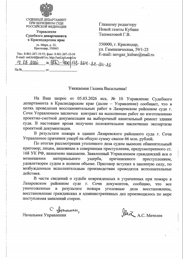 Мы поинтересовались у начальника Управления судебного департамента в Краснодарском крае Алексея Метелева, когда завершатся восстановительные работы и Лазаревский районный суд возобновит работу в здании, определен ли материальный ущерб от пожара? Восстановлены ли утраченные и поврежденные документы, в полном ли объеме?