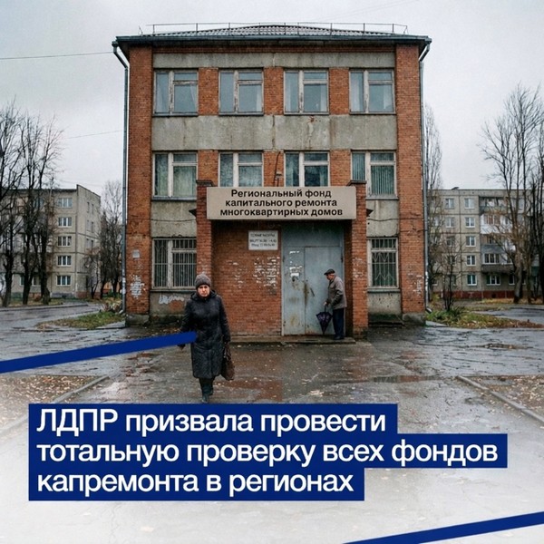 Лидер партии Леонид Слуцкий призвал Счётную палату провести финансовую проверку всех региональных фондов капремонта на предмет целевого использования денег, собранных с граждан. По итогам ЛДПР подготовит предложения, чтобы ужесточить контроль за расходованием этих средств и пресечь хищения.