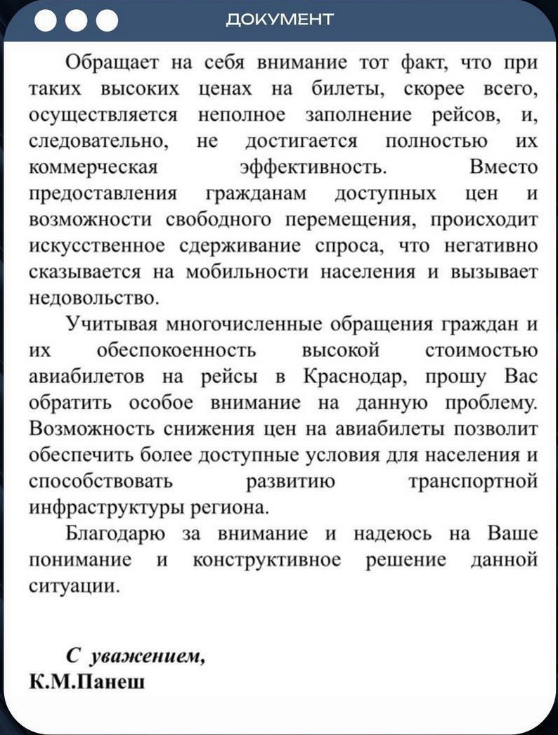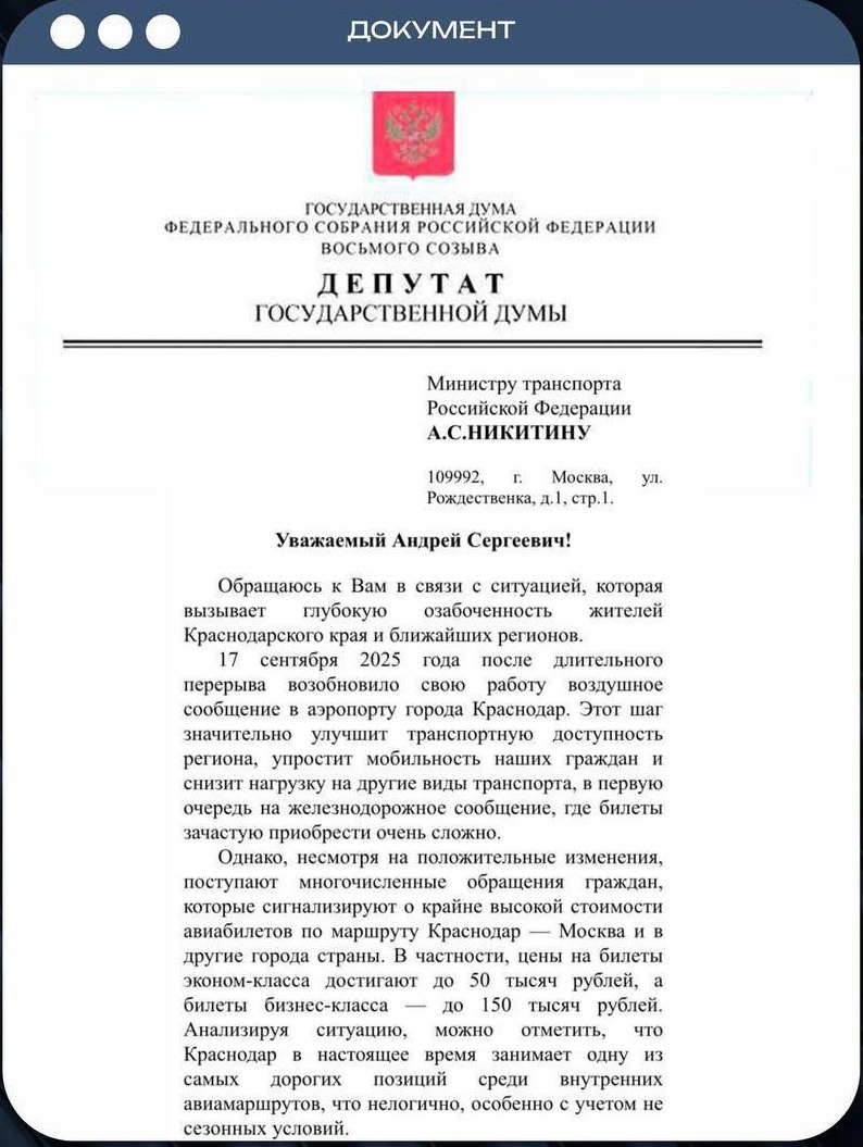 По многочисленным обращениям граждан парламентарий обратился к Министру транспорта РФ в связи с высокими ценами на авиабилеты из Краснодара