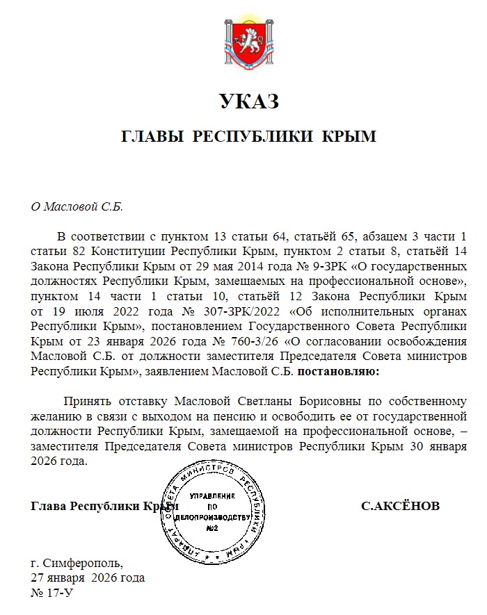 «Принять отставку Масловой Светланы Борисовны по собственному желанию в связи с выходом на пенсию и освободить ее от государственной должности Республики Крым, замещаемой на профессиональной основе, – заместителя Председателя Совета министров Республики Крым 30 января 2026 года».