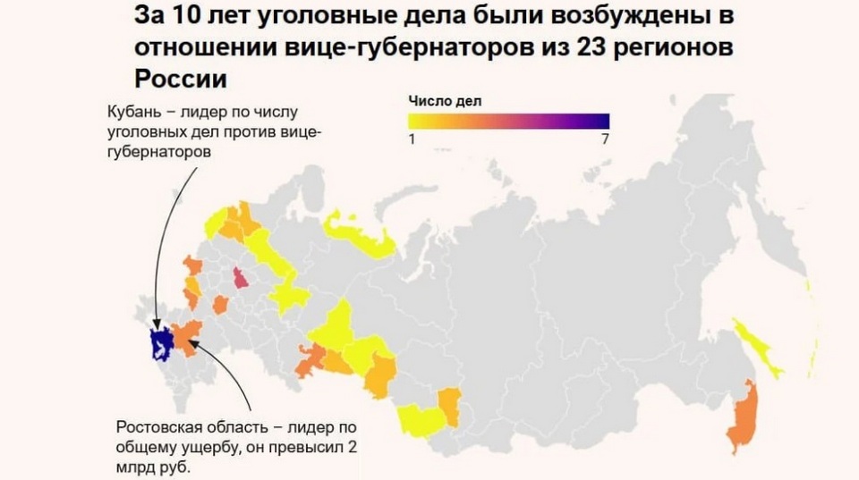 Всего за 10 лет под преследование попали 50 вице-губернаторов. Рекордное число – семь заместителей – у губернатора Краснодарского края Вениамина Кондратьева, который руководит регионом с апреля 2015 года.